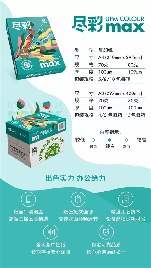 盡彩復(fù)印紙色澤鮮亮,紙質(zhì)細(xì)膩,纖維均勻,紙面無(wú)明顯的正反差,挺度好友彈性。 白度:LSO白度,亮度,對(duì)457波長(zhǎng)反射率。(如攝氏溫度)CLE白度,視覺(jué)白度,全光源德反射總和。(如:華氏溫度) 色相:造紙用的漂白劑,增白劑和色素,在漿纖維自身白度上提高10度以內(nèi)為限。強(qiáng)行增白,在燈光下看還是灰暗,過(guò)度增白紙會(huì)變脆,很快會(huì)泛黃變暗。 平整度:看復(fù)印紙過(guò)機(jī)前的平整度和過(guò)機(jī)后的平整度。 灰粉高低:靜電復(fù)印紙中灰粉不超過(guò)15%為好,高了透氣性差,復(fù)合印后紙會(huì)曲卷。 掉粉:紙張?jiān)谑褂眠^(guò)程中均有粉塵掉出,掉粉要少,粉塵的顆粒要細(xì)為好紙。